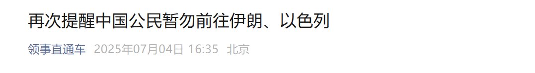 据领事直通车公众号,近日,以色列与伊朗宣布停火,但地区局势仍存在很大不确定性,两国安全形势依然严峻复杂。外交部领事司和中国驻伊朗、以色列使领馆再次提醒中国公民暂勿前往伊朗、以色列,已在当地的人员和机构尽快撤离或转移至安全地区。如遇紧急情况,请及时报警并与中国驻当地使领馆取得联系。